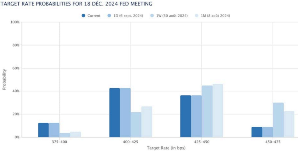 We note here the impact on the Nov 7 meeting pricing from the jobs print, which increased the market-implied likelihood of an additional 25bps or 50bps cut vs no additional cuts. This shows that the jobs report, while quite mixed, was viewed by the market as skewed to the downside, hence the pricing for the subsequent meeting. A similar story can be read in the December meeting as well.