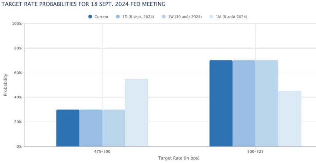 The market broadly interpreted the data to imply a 25bps cut (70% chance) over 50bps at the next Fed policy meeting. Here are some charts that provide context as to the market reaction: