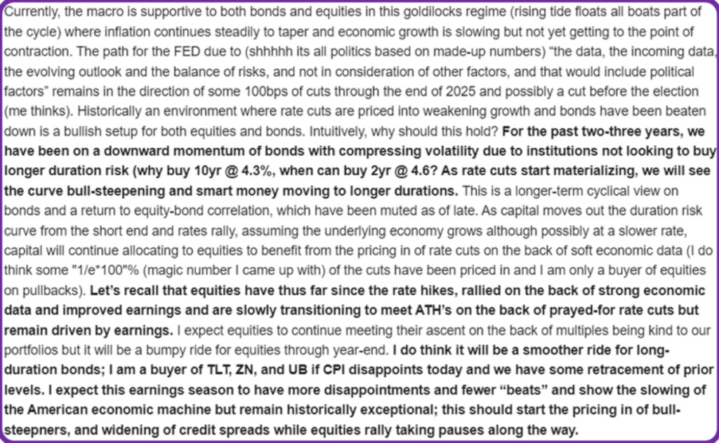 I also expect a continued inverse correlation between equities and bonds to persist through the next few economic prints while we obtain clarity on the direction of growth and consider maintaining long bonds across durations (focus on ZT - 2y and ZN - 10y) currently as a hedge for the lazy equity longs.