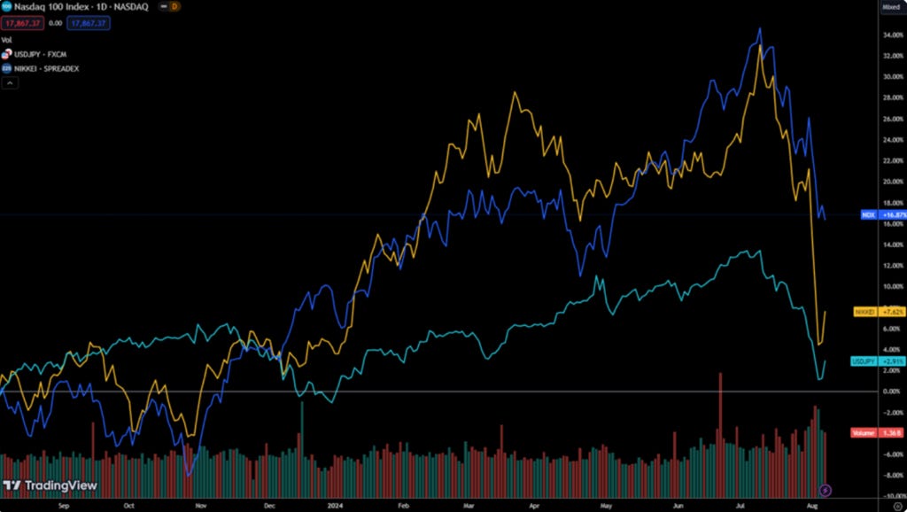 I want to quickly mention an uncomfortable situation the central banks find themselves in due to this positional unwind which could change the current general trajectory of the cycle. The cheap Yen funding short was used by both Japanese and foreigners buying Mag 7 and Japanese equities respectively which caused the three assets to become highly correlated. All that was needed was for the expectation carry between USD and JPY to narrow at a faster pace than had been priced before the start of growth scare talks. For now I don't have an answer to how much has been flushed out, JPM claims 75% for now but we shall see.
