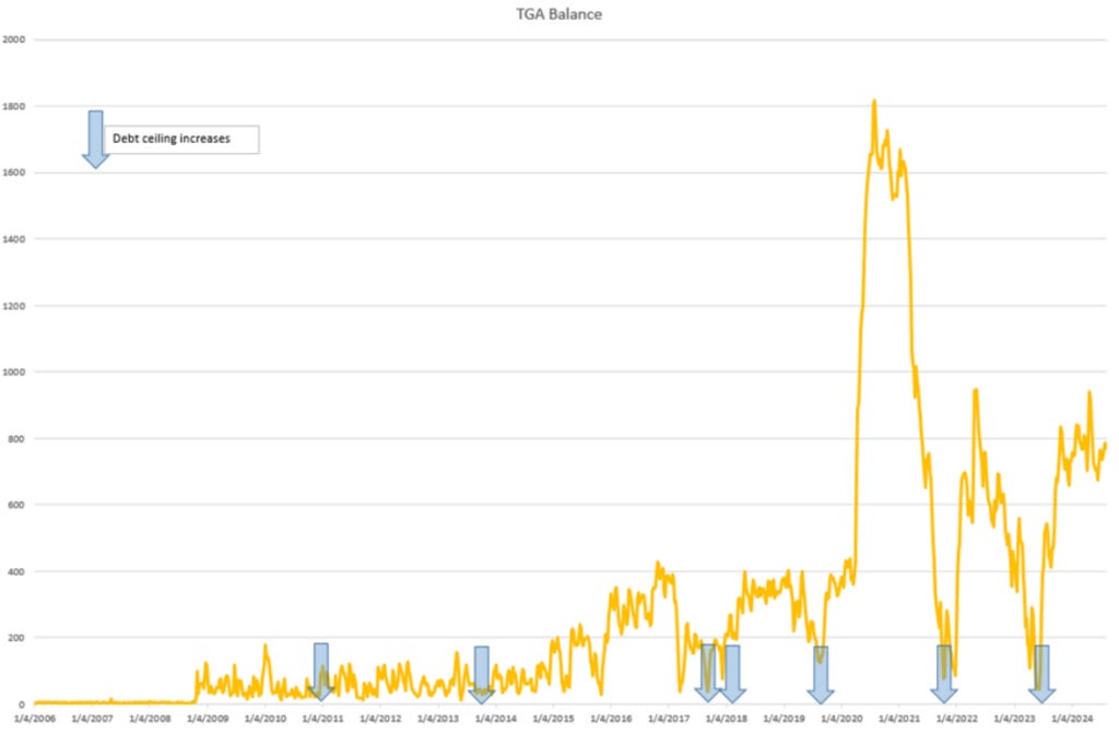 Another source of balance sheet easing we can expect to kick off in 2025 comes from the potential shrinking of the TGA balance which incidentally is also inflationary, hence the importance of having hedges across the various paths the economy can take. Taking the TGA balance out of the first plot in this section helps us appreciate the mechanics we can expect given the natural behavior for the TGA and what can be anticipated from the coming election results.