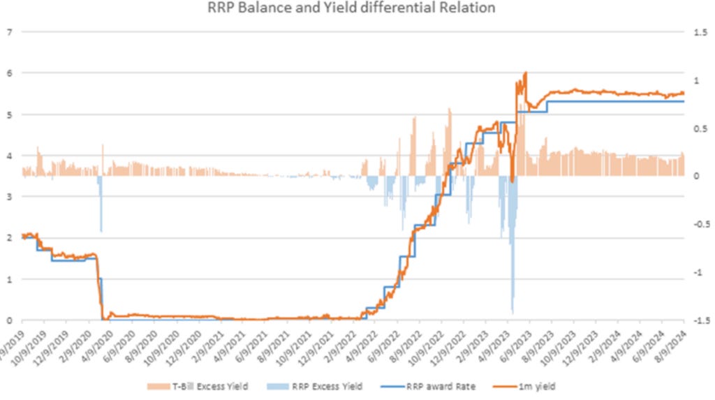 During the easing cycle post covid, the RRP balance grew from 0 to $2.5tr from early 2021 to early 2023 and represented about 30% of the Fed’s balance sheet. This effectively absorbed the stimulus from QE during that period. On June 1’st 2023, through congressional wrangling, the debt ceiling was lifted (surprise surprise) to avoid a technical default and allowed the treasury to issue T-bills (short-term debt) and fill the gap left by COVID-19 stimulus in the TGA. Part of the reason for issuing T-bills in particular is to avoid locking in higher rates with longer duration given the anticipated rate cuts and maintaining stable long-duration yields. The constant supply of T-bills into the market caused yields on the short end to rise above the policy rate for the market to absorb the increased issuance. Due to the excess supply, the bond yield has stayed above the RRP award rate which created a draw away from the RRP by MMF’s adding to the volume of high-velocity money in the economy and raising liquidity in the system offsetting the tightening caused by QT and Treasury bond issuances to the public markets.
