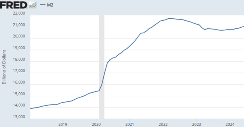 What is the net effect of all these shenanigans on the monetary base (M2)? We see through 2024, the circulating amount of money steadily increasing which reflects the net easing the economy has experienced during this period of monetary tightening.