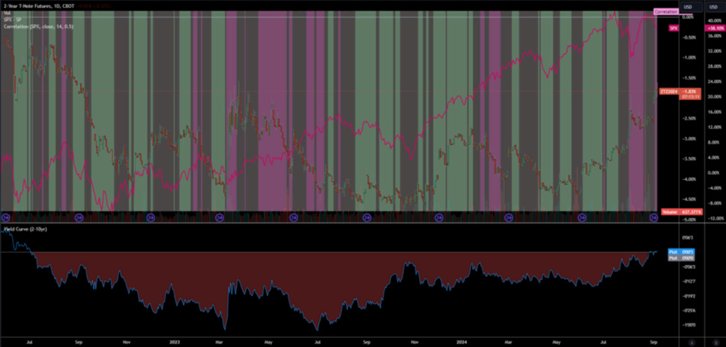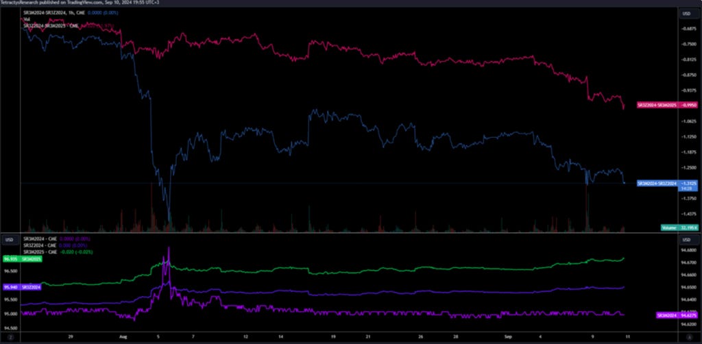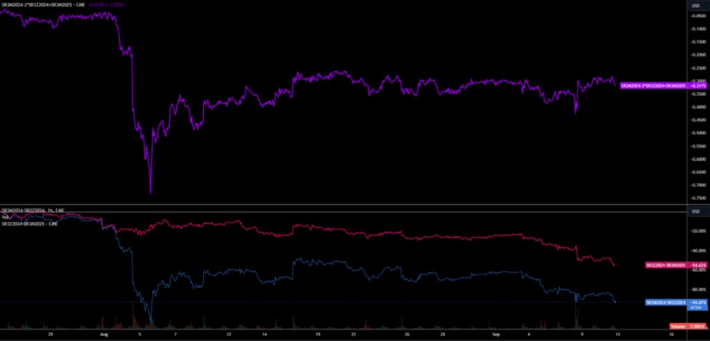 I would consider adding position back tactically on any pullbacks on the spread. I expect that FOMC will be the correct opportunity to go long bonds via ZT and ZN after the expectations on the 50bps cut get washed away, and we see pricing along the curve fall in line with 25bps each meeting, assuming that the data keeps coming in mixed.