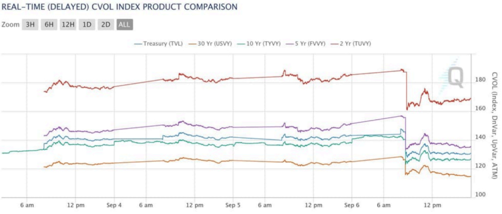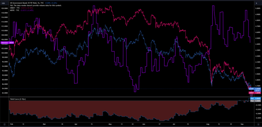 Now we need to go back to evaluating the bull-steepner on the yield curve, which we took off on Aug 5’th. We remain at a point of heightened bond volatility, as seen through the MOVE index.