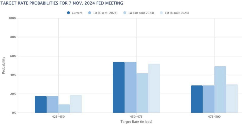 We note here the impact on the Nov 7 meeting pricing from the jobs print, which increased the market-implied likelihood of an additional 25bps or 50bps cut vs no additional cuts. This shows that the jobs report, while quite mixed, was viewed by the market as skewed to the downside, hence the pricing for the subsequent meeting. A similar story can be read in the December meeting as well.