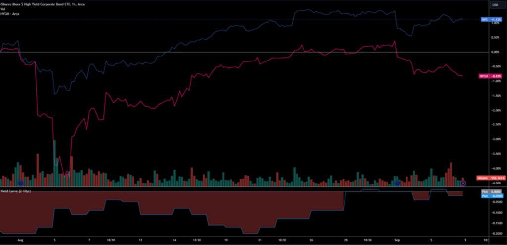 The HYG/HYGH etf (High Yield Bonds and its rates hedged brother) is intuitively the most straightforward way to do this, and a well-timed short would have paid during Aug 5’th (I don’t like any strategy that requires good timing…).